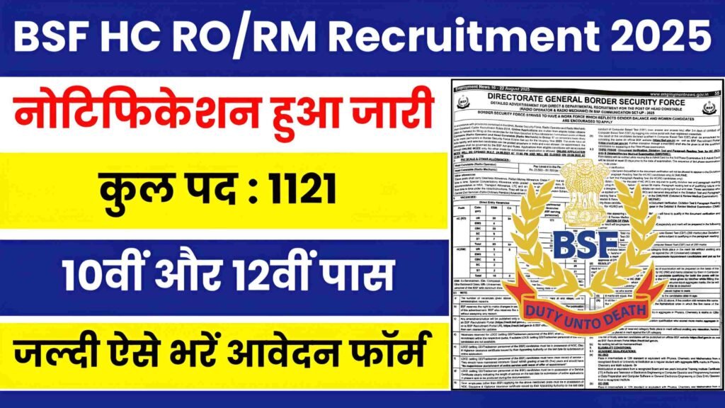 BSF Head Constable RO/RM Recruitment 2025: बीएसएफ में निकली 10वीं – 12वीं पास के लिए 1121 पद पर बंपर भर्ती, जल्दी ऐसे भरें आवेदन फॉर्म BSF Head Constable RO/RM Recruitment 2025 : नमस्कार दोस्तों स्वागत है आप सभी का आज के हमारे इस नए आर्टिकल में दोस्तों अगर आप भी सरकारी नौकरी का तैयारी कर … Continue reading BSF Head Constable RO/RM Recruitment 2025: बीएसएफ में निकली 10वीं – 12वीं पास के लिए 1121 पद पर बंपर भर्ती, जल्दी ऐसे भरें आवेदन फॉर्म