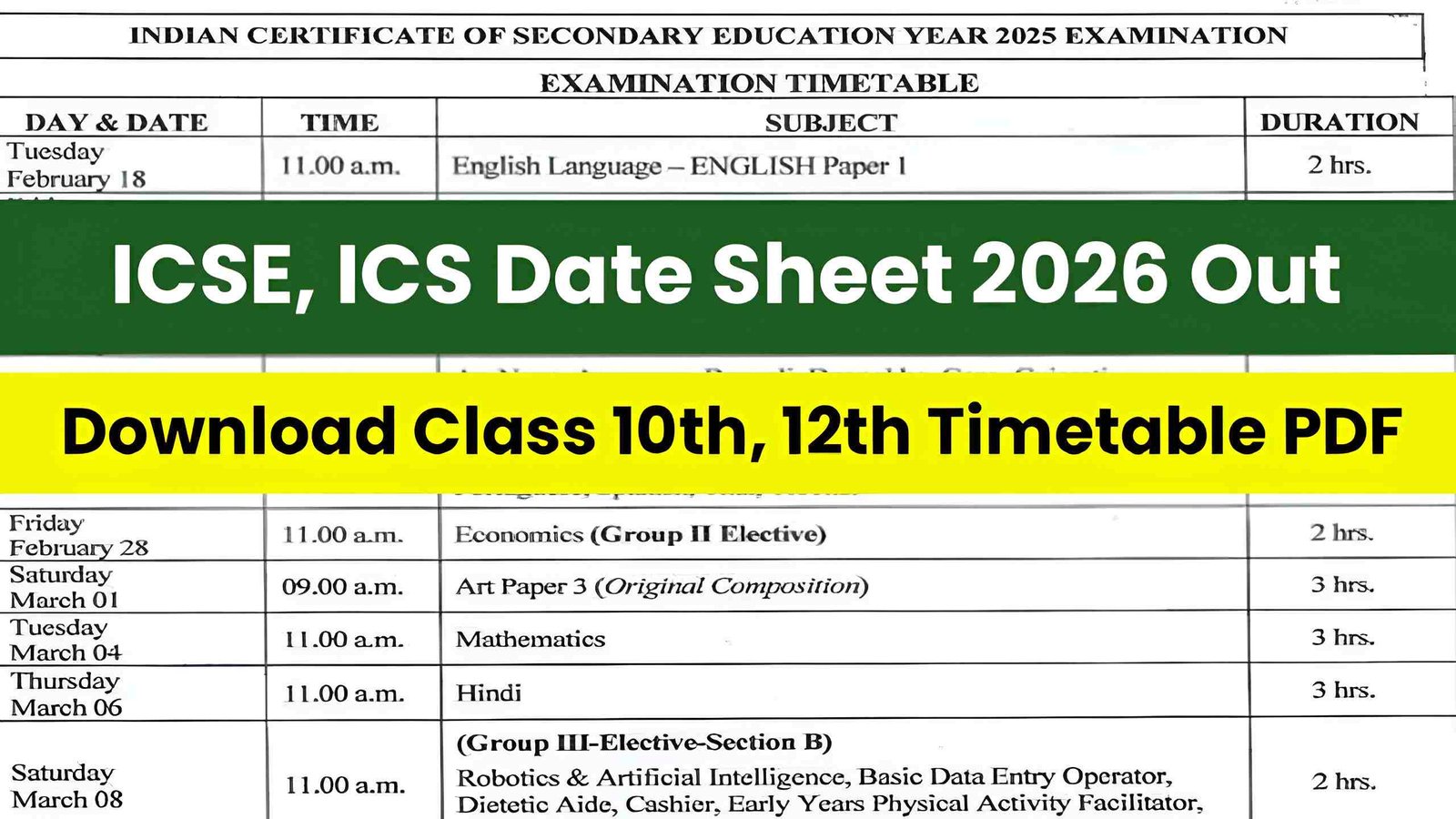 ICSE, ISC Date Sheet 2026 Out, Check Class 10th, 12th Subject-Wise Timetable PDF